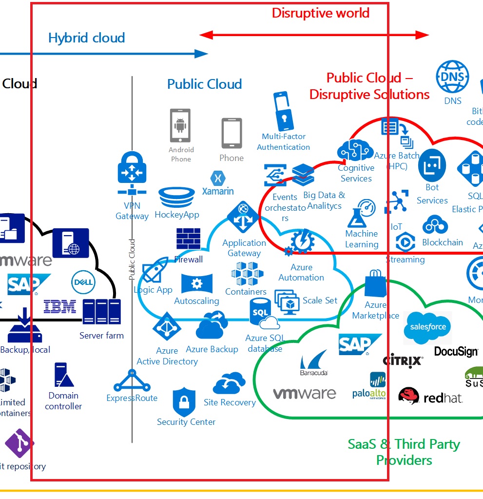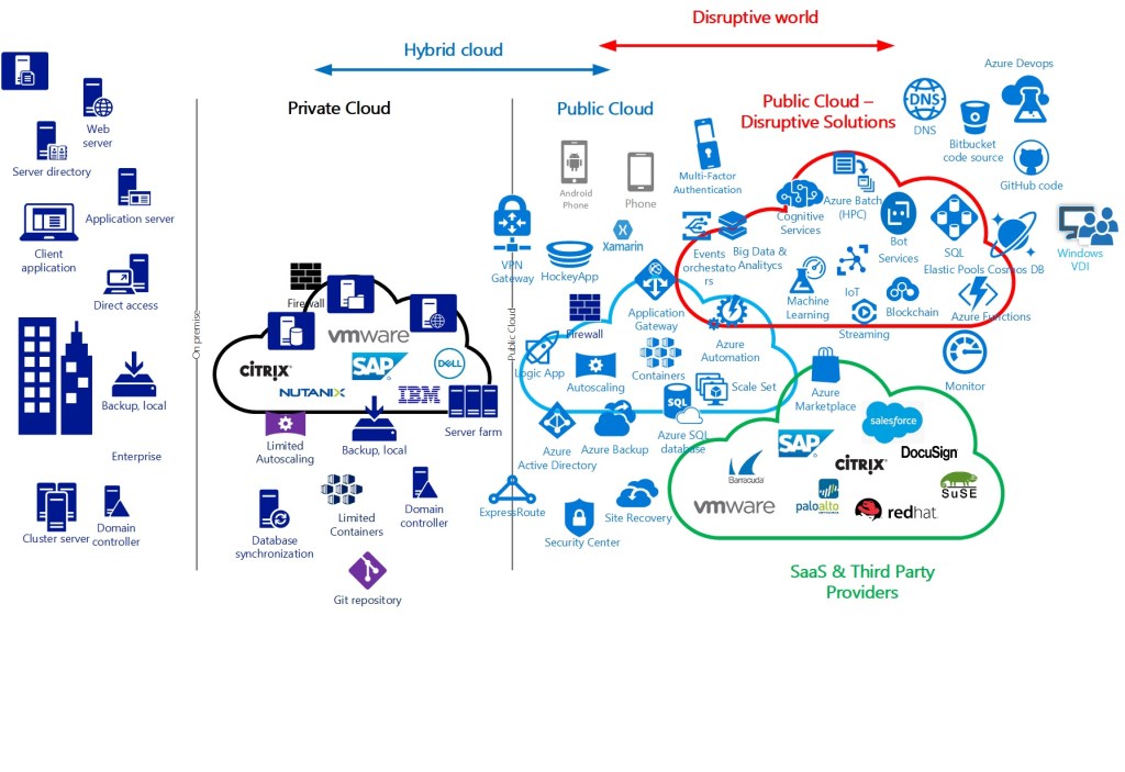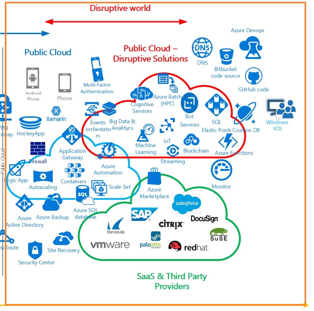 A moderate IT Profile – Would be a company which is more focus on providing an APP or an ecommerce platform with almost no downtime and escalation based on seasonal products. Maybe even they are migrating some specific workloads to bring innovation, to work on a global way with other subsidiaries or to leverage the potential of some disruptive solution like bots to improve the User Experience for their customers. The hardware almost disappear in this kind of companies. They have a hybrid model solution and are starting to embrace the disruption on new cloud native solutions like are cognitive services, machine learning or data analytics. -They are even integrating SaaS technologies like Docusign, use the marketplace to replace some thirty party products that before were present on the previous on premise data center, they had. An example of this profile can be retail companies offering a new online shopping experience, etc.