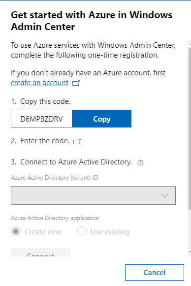 If you click on hybrid center you can configure an account on your azure portal to connect to your azure suscriptions. It will create an Azure AD application from which you can manage gateway user and gateway administrator access if you want in the future. Therefore you will need to first register your Windows Admin Center gateway with Azure. Remember, you only need to do this once for your Windows Admin Center gateway.